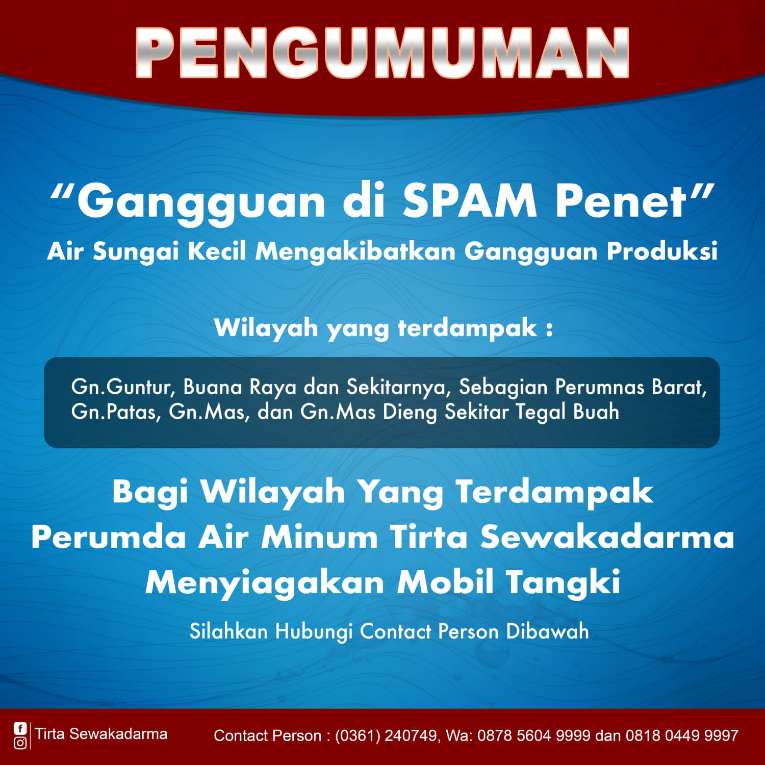 Sehubungan dengan adanya gangguan produksi di SPAM. Penet tanggal 26 Oktober 2021 akibat air baku sungai kecil yang menyebabkan proses produksi tidak maksimal, maka dengan ini diberitahukan kepada pelanggan Perumda Air Minum Tirta Sewakadarma Kota Denpasar akan mengalami gangguan pengaliran air pada tanggal tersebut diatas dan diharapkan pekerjaan perbaikan dapat selesai tepat waktu atau lebih cepat dari waktu yang ditentukan.