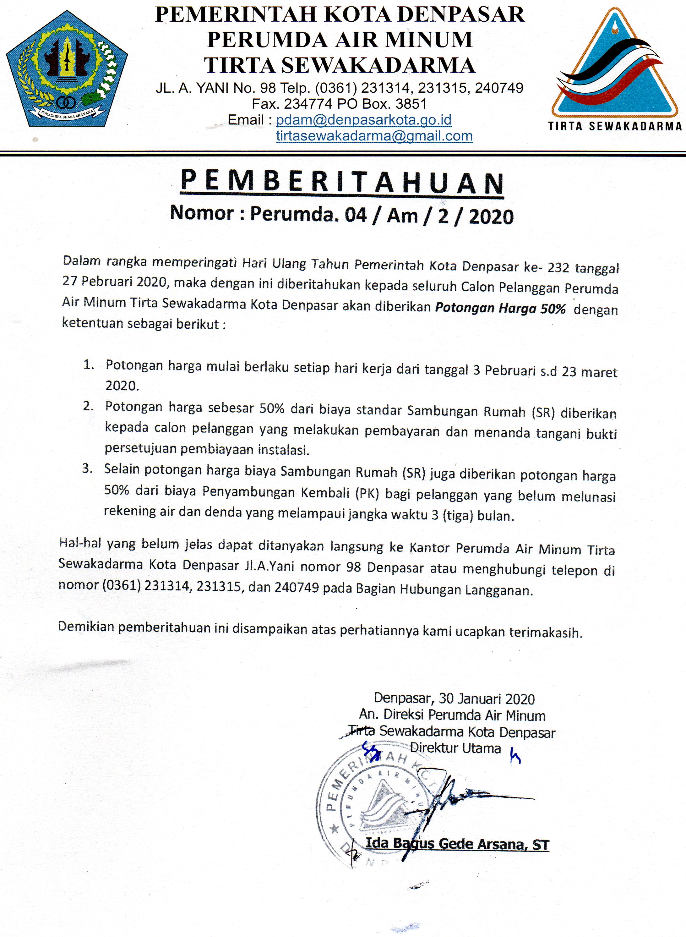Dalam rangka memperingati Hari Ulang Tahun Pemerintah Kota Denpasar ke- 232 tanggal 27 Pebruari 2020, maka dengan ini diberitahukan kepada seluruh Calon Pelanggan air minum PDAM Kota Denpasar akan diberikan Potongan Harga 50% dengan ketentuan sebagai berikut: