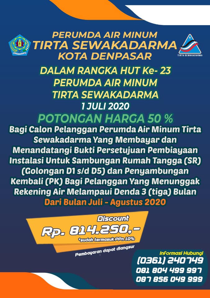 Gebyar Discount 50% untuk Sambungan Baru(SR) untuk Golongan (D1 s.d D5) dan Penyambungan Kembali (PK) dalam rangka HUT. Perumda Air Minum Tirta Sewakadarma ke 23