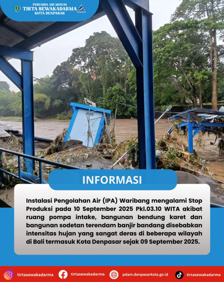 Instalasi Pengolahan Air (IPA) Waribang mengalami Stop Produksi tanggal 10 September 2025 pkl.03.10 Wita akibat Ruang pompa intake, bangunan Bendung karet dan bangunan sodetan terendam banjir bandang disebabkan intensitas Hujan yg sangat deras di beberapa wilayah di bali termasuk Kota Denpasar dari tanggal 09 September 2025.