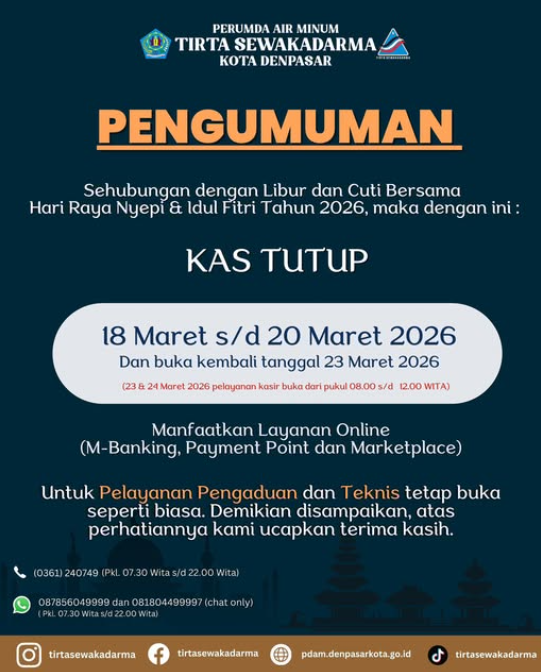 Untuk info lebih lanjut dapat menghubungi kantor Perumda Air Minum Tirta Sewakadarma Jl. A. Yani no. 98 di nomor (0361) 240749 bagian pengaduan dan WhatsApp (WA) Pengaduan di nomor 087856049999 dan 081804499997.