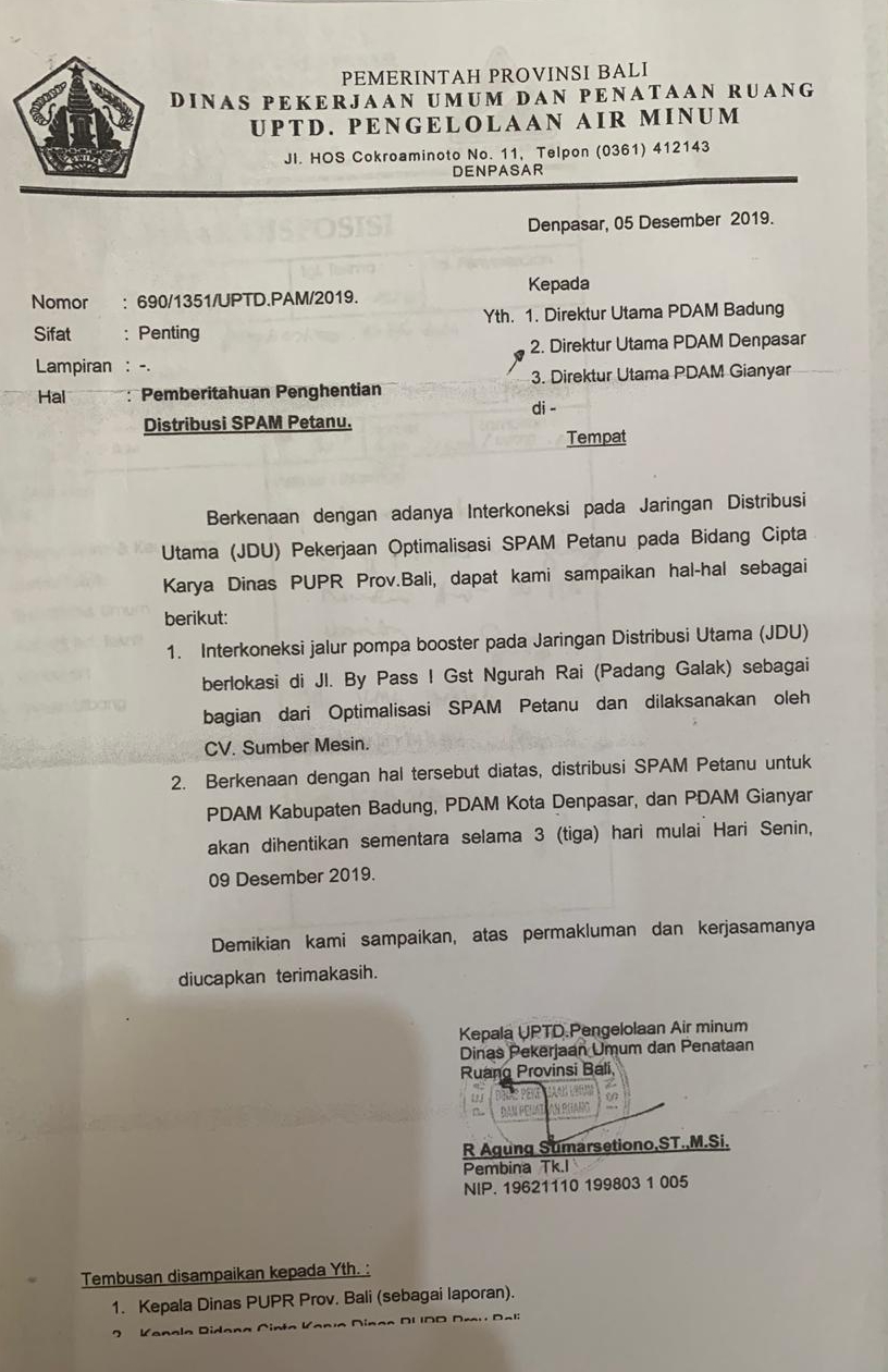 Sehubungan dengan adanya Interkonek pada Jaringan Distribusi Utama (JDU) jalur pompa boster pada jaringan Distribusi Utama (JDU) pekerjaan optimalisasi SPAM Petanu pada bidang Cipta karya Dinas PUPR Provinsi Bali di Jl. By Pass I Gusti Ngurah Rai (Padang Galak) Denpasar sesuai surat dari Dinas Pekerjaan Umum dan Penataan Ruang (UPTD) Pengelolaan Air Minum Provinsi Bali nomor : 690 / 1351/ UPTD.PAM / 2019 tertanggal 5 Desember 2019 sehingga pendistribusian air ke Perumda Air Minum Tirta Sewakadarma Kota Denpasar diberhentikan sementara dari tanggal 9 Desember s.d 11 Desember 2019, maka dengan ini diberitahukan kepada masyarakat pelanggan Perumda Air Minum Tirta Sewakadarma Kota Denpasar bahwa akan terjadi gangguan pengaliran air pada tanggal tersebut diatas dan diharapkan tanggal 12 Desember 2019 sudah normal kembali.