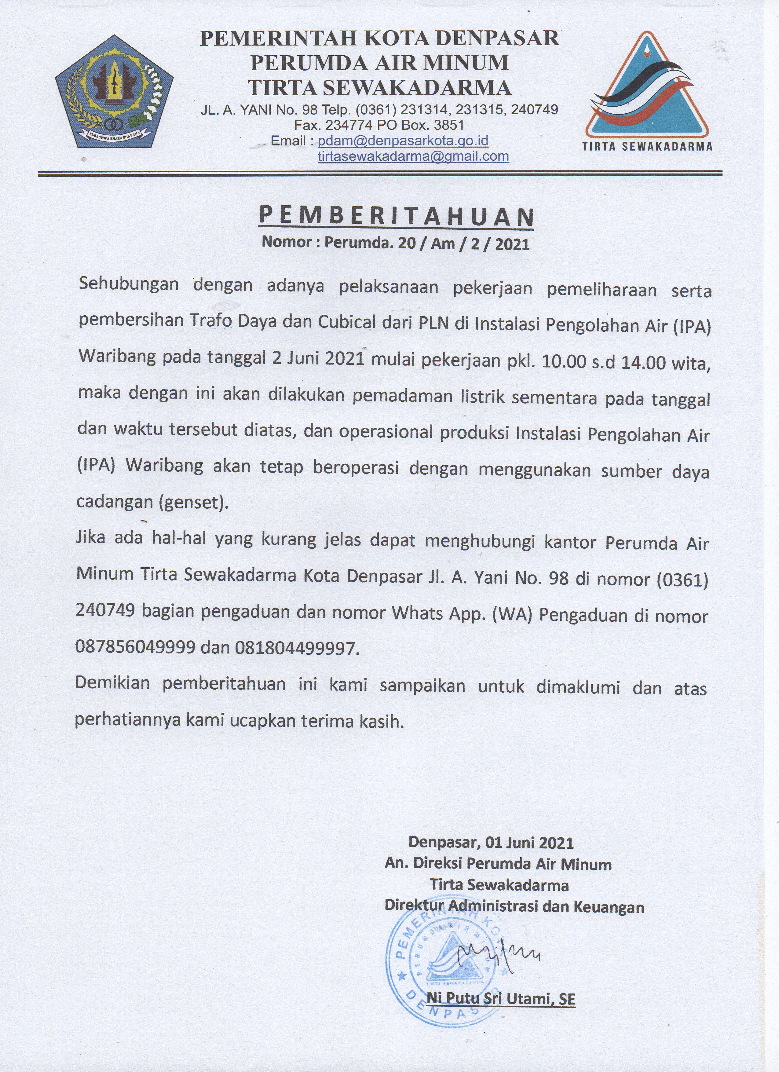 Sehubungan dengan adanya pelaksanaan pekerjaan pemeliharaan serta pembersihan Trafo Daya dan Cubical dari PLN di Instalasi Pengolahan Air (IPA) Waribang pada tanggal 2 Juni 2021 mulai pekerjaan pkl. 10.00 s.d 14.00 wita, maka dengan ini akan dilakukan pemadaman listrik sementara pada tanggal dan waktu tersebut diatas, dan operasional produksi Instalasi Pengolahan Air (IPA) Waribang akan tetap beroperasi dengan menggunakan sumber daya cadangan (genset).
