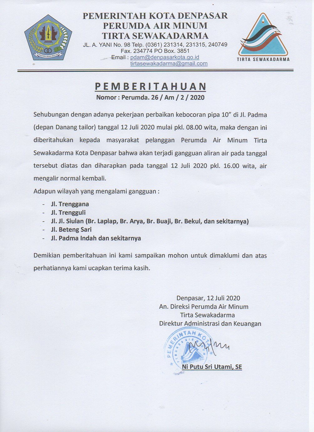 Sehubungan dengan adanya pekerjaan perbaikan kebocoran pipa 10” di Jl. Padma (depan Danang tailor) tanggal 12 Juli 2020 mulai pkl. 08.00 wita, maka dengan ini diberitahukan kepada masyarakat pelanggan Perumda Air Minum Tirta Sewakadarma Kota Denpasar bahwa akan terjadi gangguan aliran air pada tanggal tersebut diatas dan diharapkan pada tanggal 12 Juli 2020 pkl. 16.00 wita, air mengalir normal kembali.