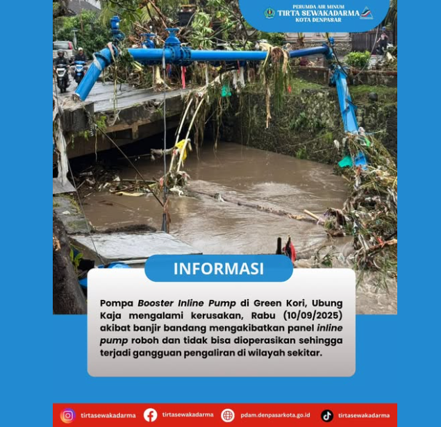Pompa Inline Pump di Green Kori Ubung Kaja mengalami kerusakan, Rabu 10/09/2025 akibat banjir bandang, sehingga menyebabkan Panel Inline Pump roboh dan tidak bisa dioperasikan. Jadi pengaliran air akan mengalami gangguan dan wilayah/ daerah terdampak sbb :