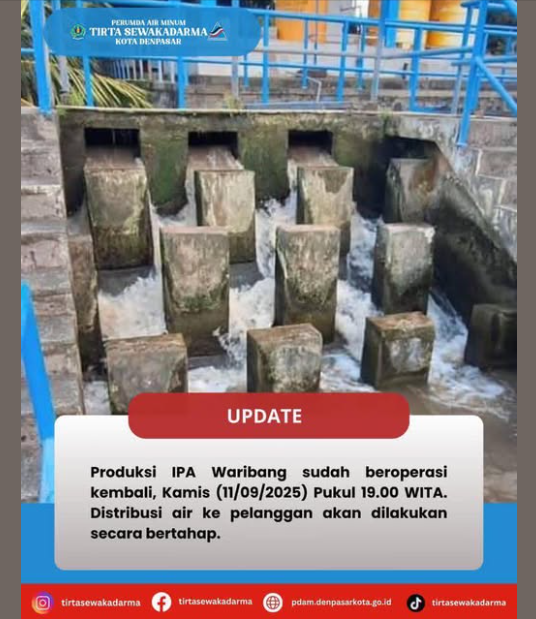 Produksi Instalasi Pengolahan Air (IPA) Waribang sudah beroperasi kembali, kamis (11/09/2025) Pkl. 19.00 Wita. Distribusi air ke Pelanggan akan dilakukan secara bertahap.