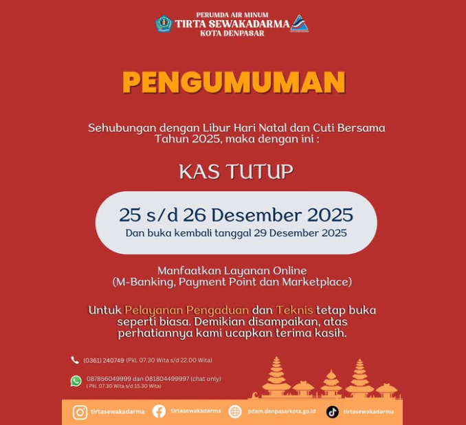 Informasi lebih lanjut dapat menghubungi kantor Perumda Air Minum Tirta Sewakadarma Jl. A. Yani no. 98 di nomor (0361) 240749 bagian pengaduan dan WhatsApp (WA) Pengaduan di nomor 087856049999 dan 081804499997 (Chat only).